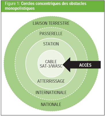 L’accès à la fibre demeure un problème dans de nombreux pays en développement. Sur la côte ouest de l’Afrique, le problème a été aggravé par la domination continue de monopoles moribonds soutenus par des réseaux de clientélisme profiteurs au sein des gouvernements. La recherche sur l’exploitation du câble SAT-3/WASC[3] a montré ce qu’il fallait faire pour briser ces monopoles (Jagun, 2008b).